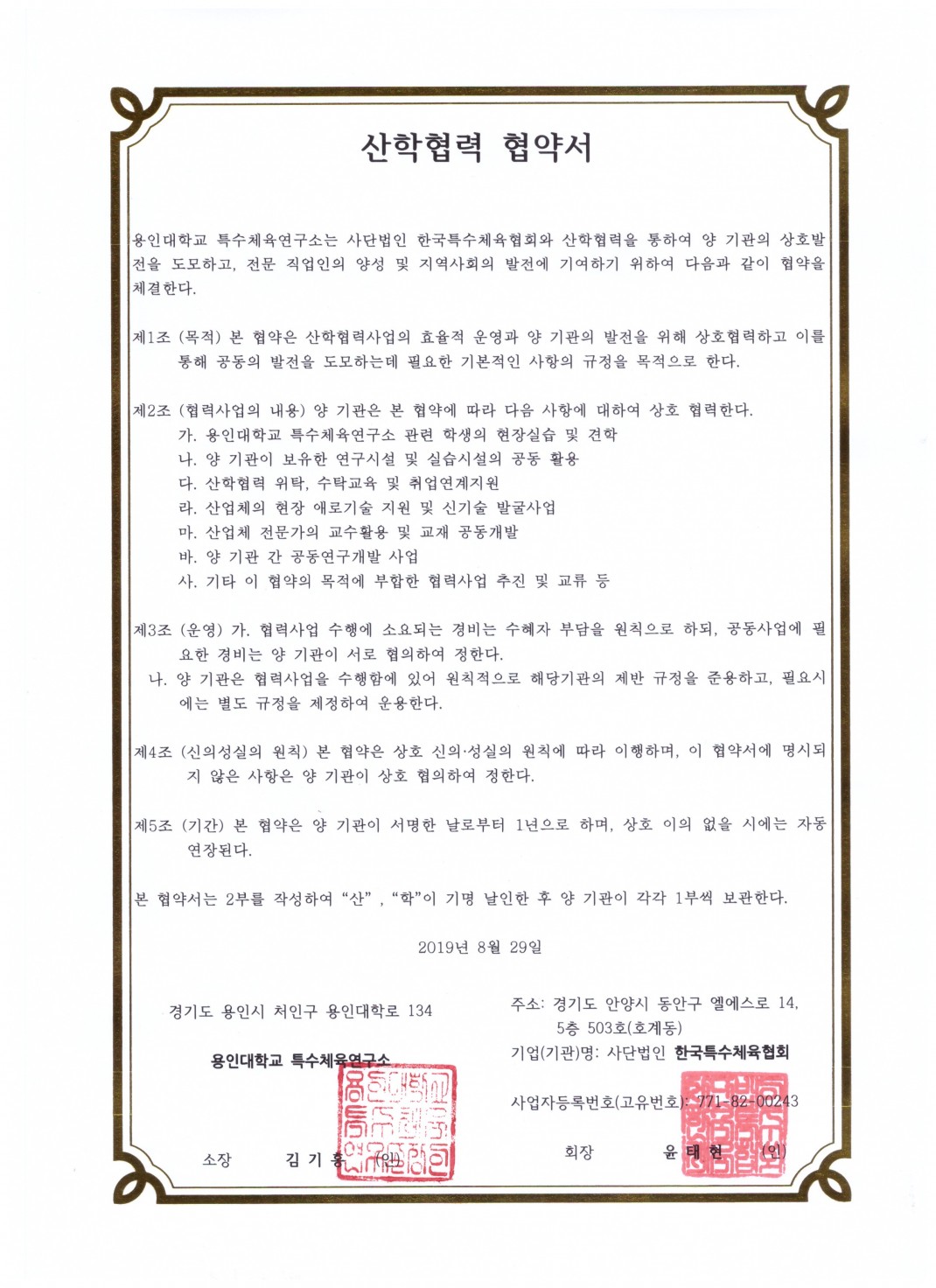 용인대학교 특수체육연구소 MOU 체결 페이지 정보 작성자 관리자 댓글 0건 조회 1,208회 작성일 19-09-06 13:02 본문 한국특수체육협회와 용인대학교 특수체육연구소가 특수체육전문지도자 양성을 위해 MOU를 체결 하였습니다. 목록 이전글2019년 하반기 한국특수체육협회 매거진 창간호 발행 19.09.30 다음글2019 한국특수체육협회 홍모물 발행 19.07.11 댓글목록 댓글목록 등록된 댓글이 없습니다.